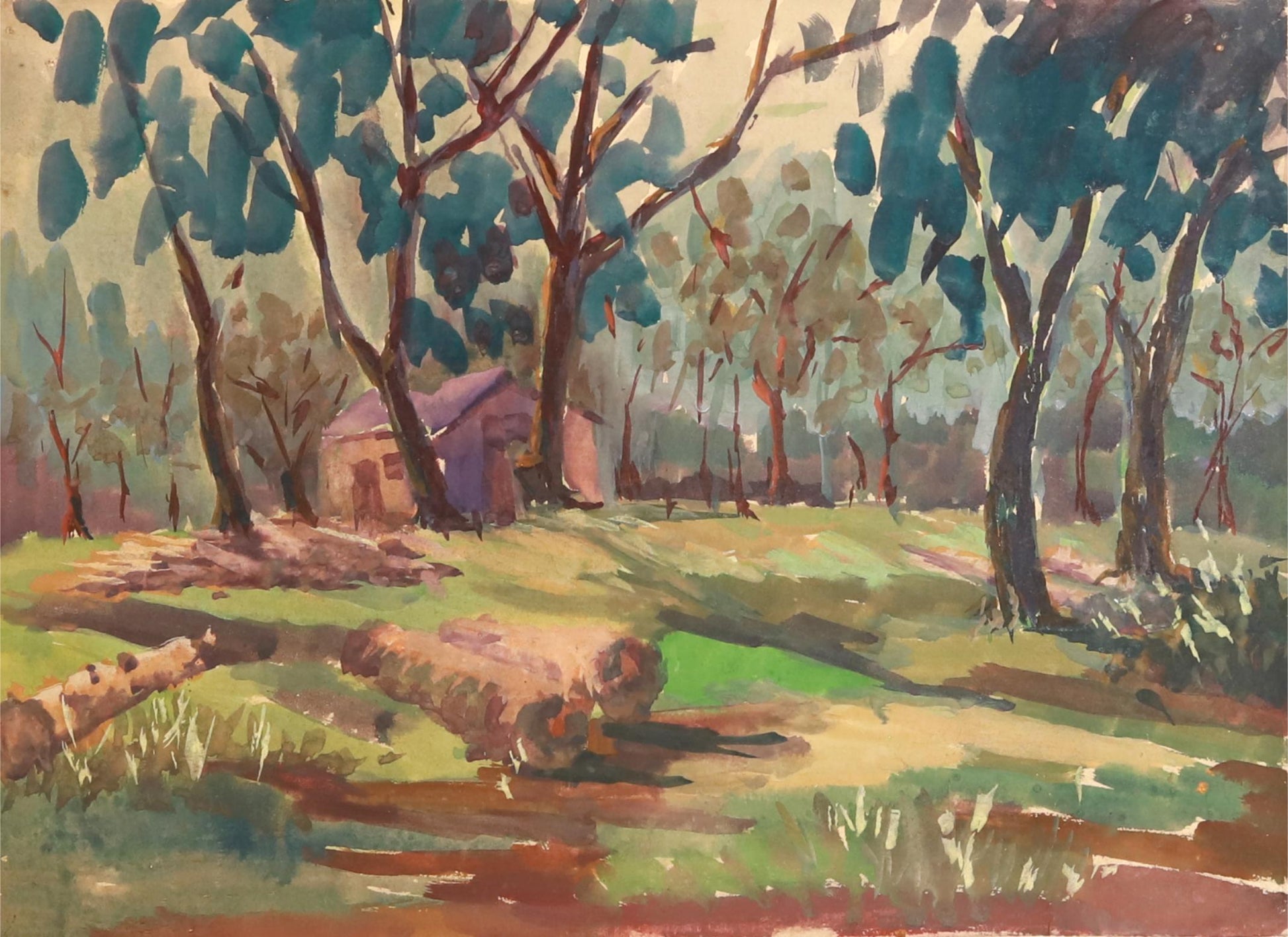 The painting features layered trees and a vibrant color palette, with warm light and cool shadows creating a tranquil yet lively autumn forest scene. The combination of cottage and woods invites viewers to share a natural pause, blending visual appeal with emotional resonance.