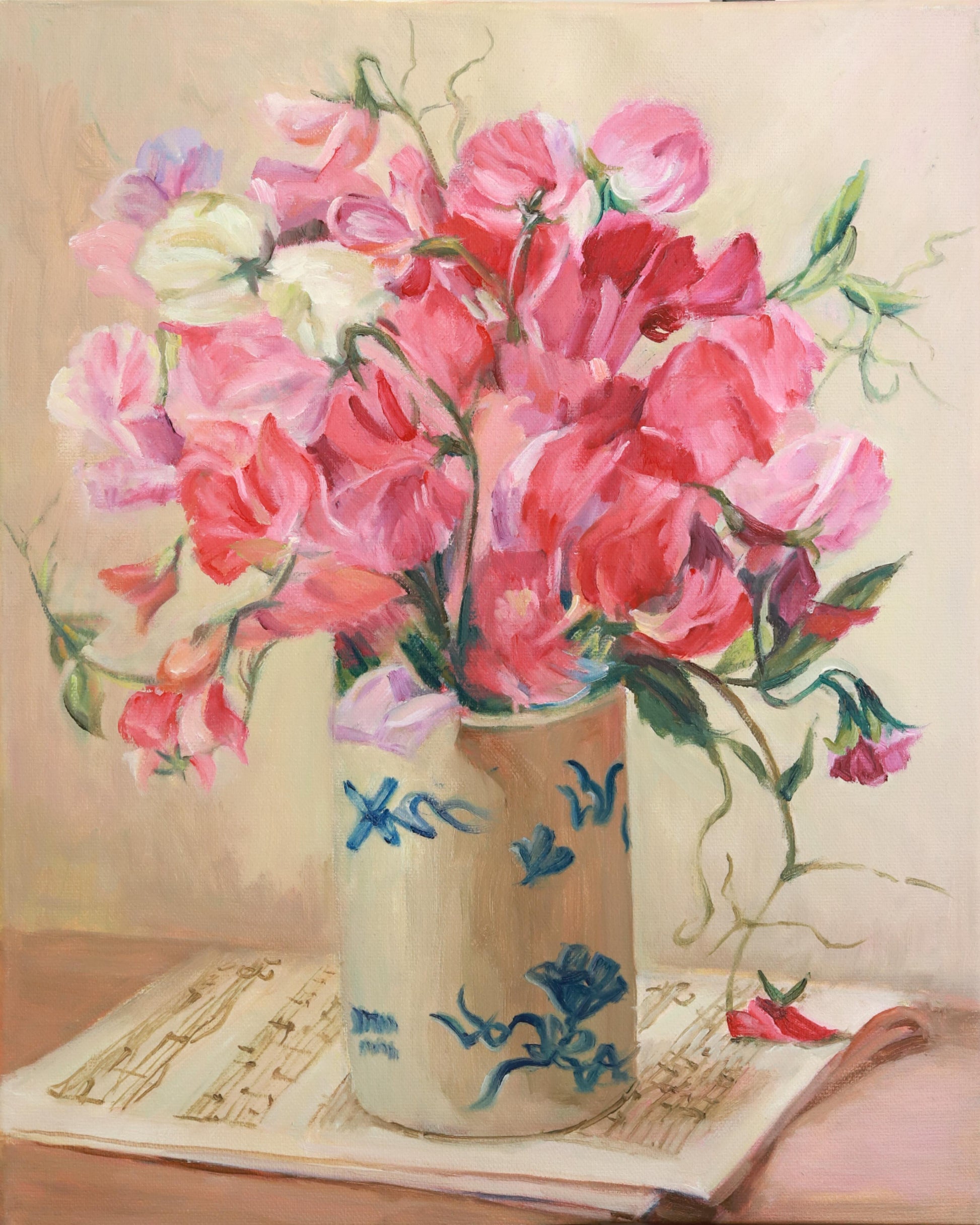 This oil painting captures the vibrant essence of sweet peas, blending the freshness of nature with artistic charm: