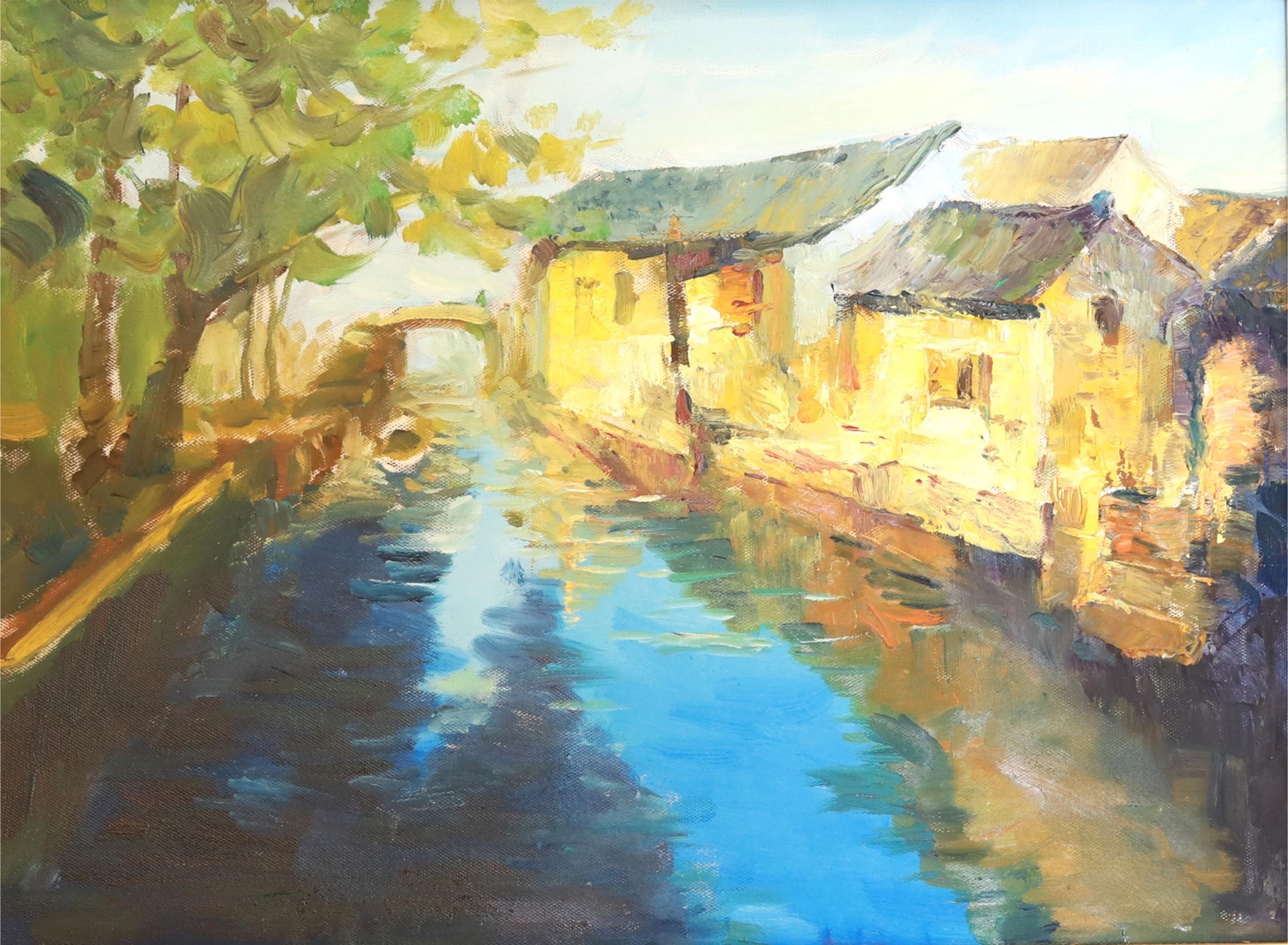 Created with high-quality oil paints on linen canvas, the painting combines impasto and glazing techniques to build rich textures. The warm yellow walls glow under sunlight, while bold strokes define the grey rooftops. The water's reflection is rendered in fluid blue-green gradients, blurring reality and dream. Every brushstroke reflects the artist's deep love for Jiangnan's scenery, blending visual appeal with collectible value.
