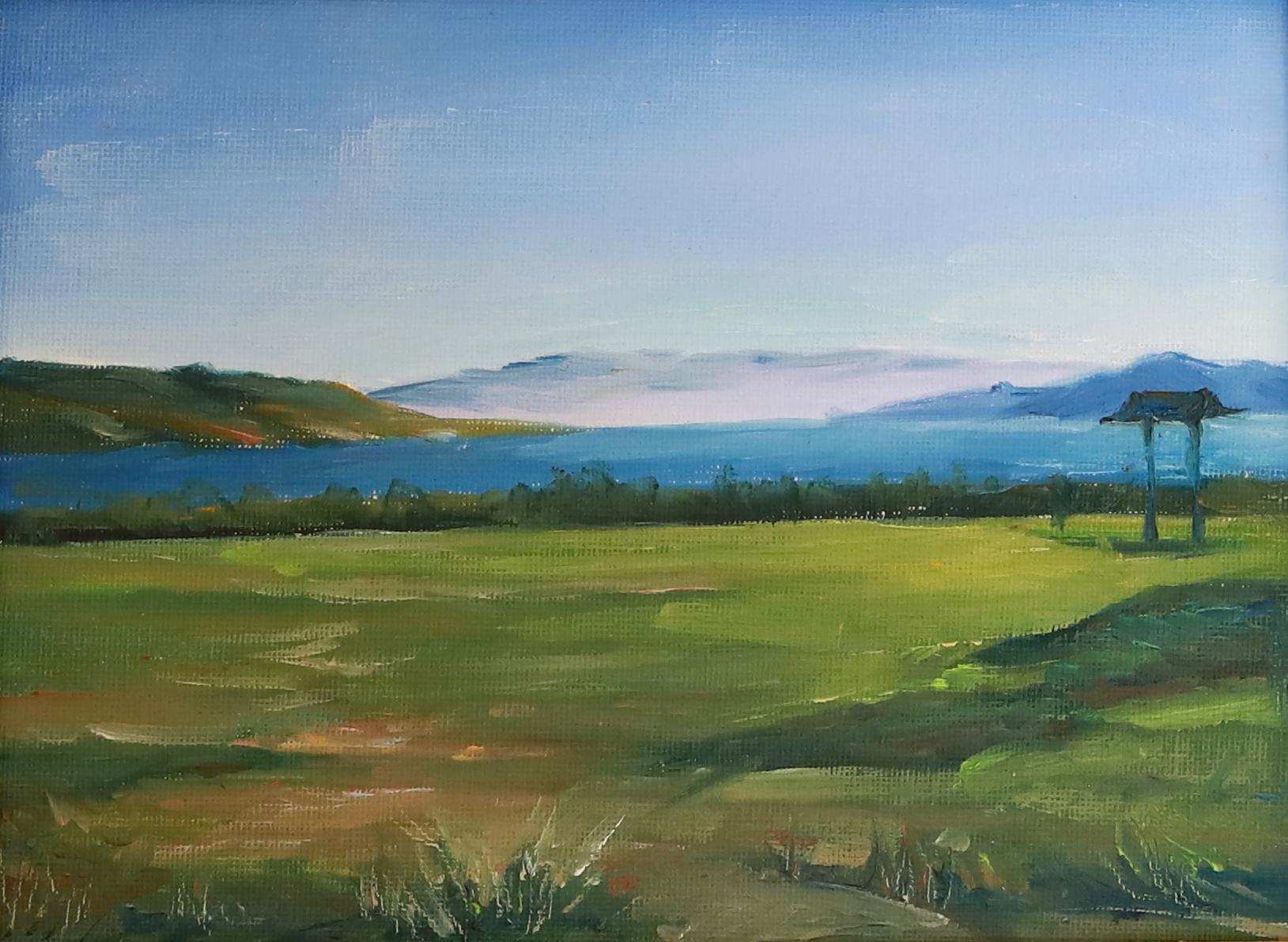 This 18x24cm canvas oil painting captures the essence of pastoral tranquility, blending distant mountains, clear skies, and intricate foreground details into a harmonious composition.