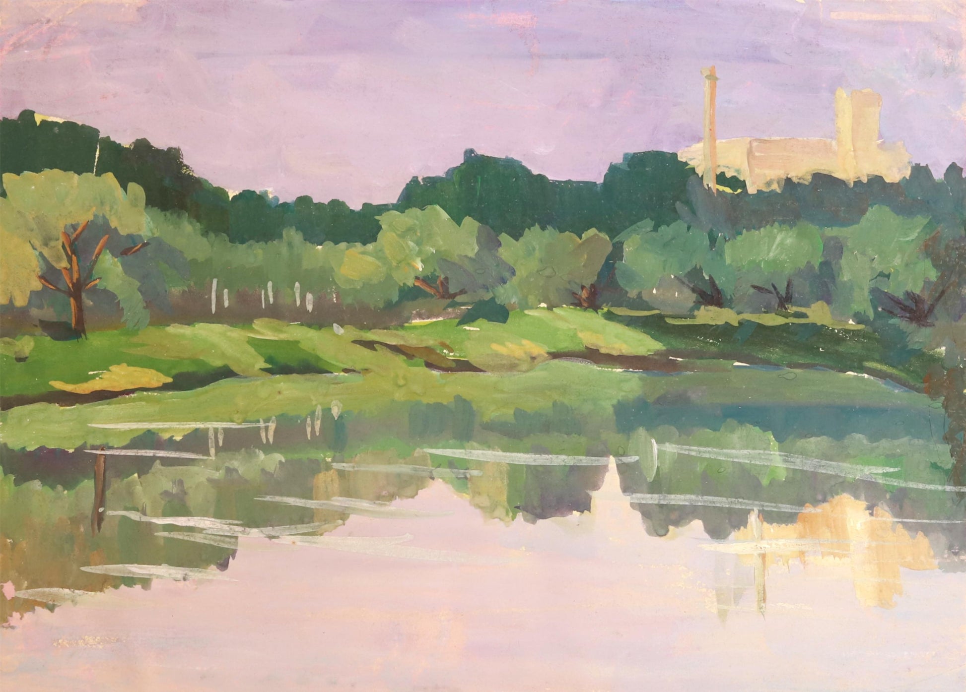 A collision of twilight purple skies and lush green fields, with warm-lit buildings like gentle stars. The delicate color layers create a soothing retreat from daily stress. -